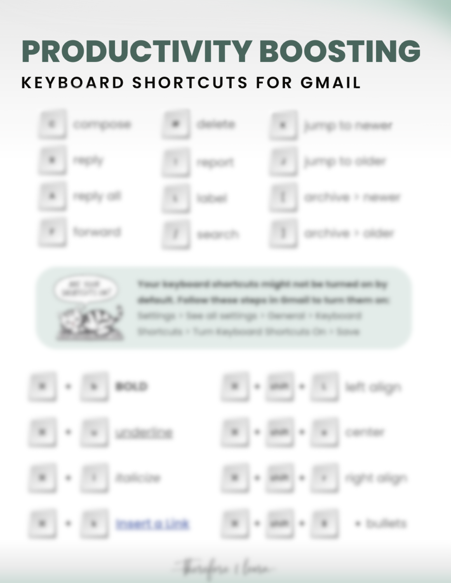 It might sound silly but you'll be impressed with how much time you save when you don't have to fumble with your mouse to navigate your inbox. Download this free printable to help you learn and remember the best keyboard shortcuts for Gmail.